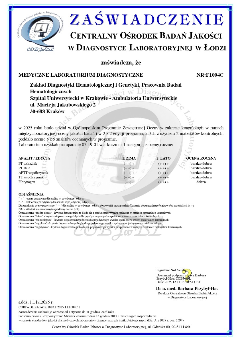 Szpital Uniwersytecki w Krakowie (z siedzibą w Krakowie przy ul. Kopernika 36, 31-501 Kraków, wpisany do rejestru stowarzyszeń, innych organizacji społecznych i zawodowych, fundacji oraz samodzielnych publicznych zakładów opieki zdrowotnej KRS prowadzonego przez Sąd Rejonowy dla Krakowa - Śródmieścia, XI Wydział Gospodarczy pod nr KRS: 0000024155) oświadcza, że testy diagnostyczne wykonywane w Zakładzie Diagnostyki Hematologicznej