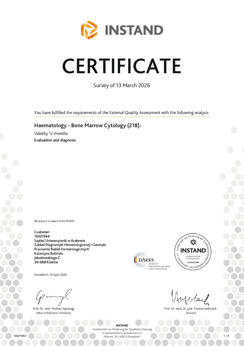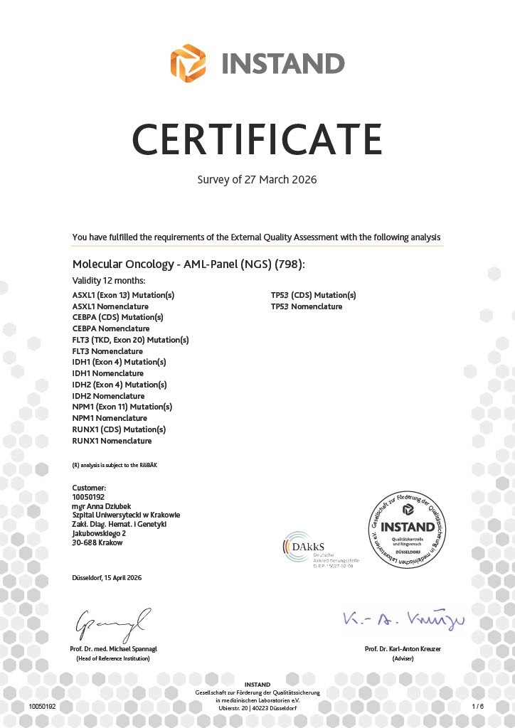 - Pracownia, od 2009 roku, jako jedyne Polskie laboratorium posiada certyfikaty międzynarodowej kontroli jakości badań cytogenetycznych w nowotworach hematopoetycznych CEQA