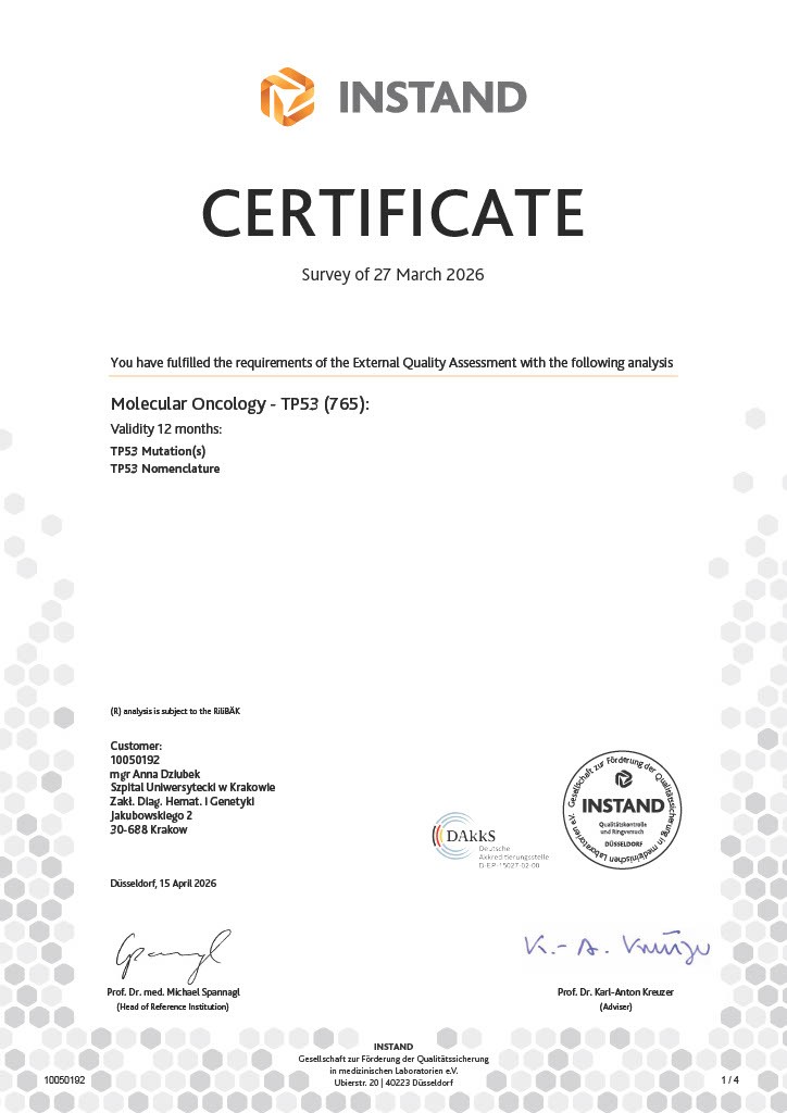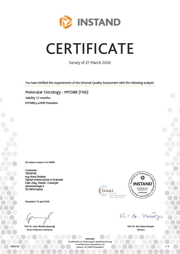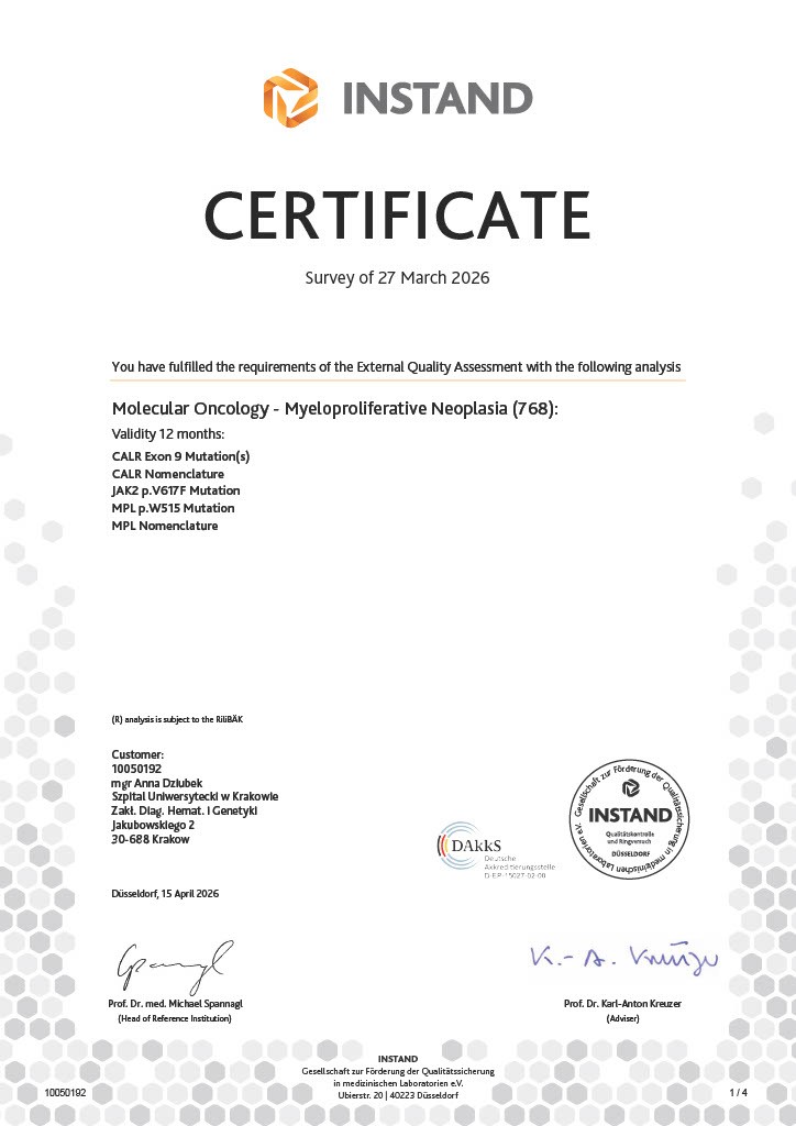 Najwyższą jakość i wiarygodność wykonywanych oznaczeń, przeprowadzanych zarówno dla pacjentów Szpitala Uniwersyteckiego jak i dla pacjentów innych polskich szpitali, a także pacjentów spoza granic Polski w ramach badań klinicznych, potwierdzają otrzymywane certyfikaty udziału w krajowych oraz międzynarodowych kontrolach jakości, a Pracownia Diagnostyki Molekularnej odpowiada za standaryzację oznaczeń molekularnych w przebiegu przewlekłej białaczki szpikowej w pozostałych Pracowniach Biologii Molekularnej w Polsce.